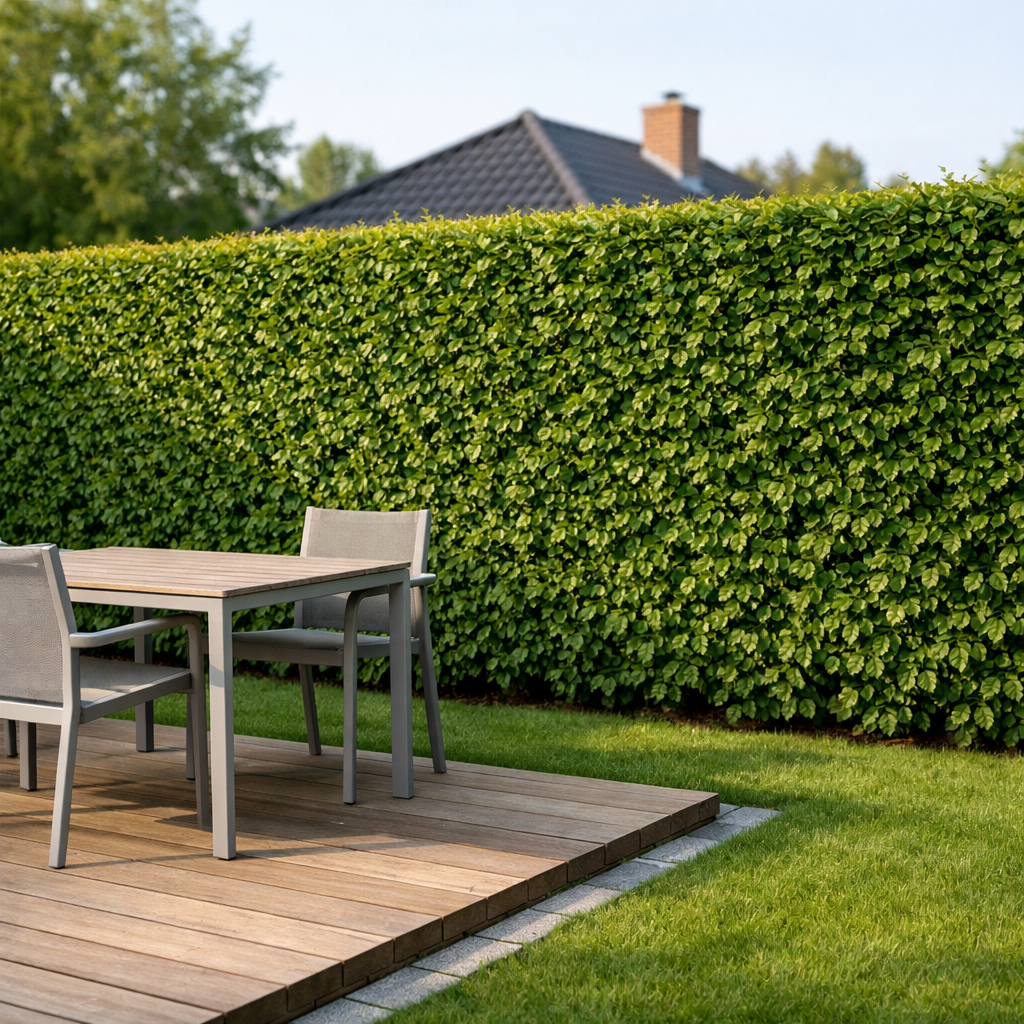 27 marts 2024 7 min 4404 Sist oppdatert 7 februar 2026 av Therese Hermansson Indholdsfortegnelse Hvad afgør om en hæk giver ægte privatliv?Sammenlign populære hække til privatlivVælg efter behovThuja Smaragd – slank, tæt og privatliv hele åretLiguster ‘Liga’ – hurtig, alsidig og robustKirsebærlaurbær – bløde linjer og stor bladfyldeEfeu på hegn – maksimal skærm på minimal pladsKlippet eller uklippet hæk?Hurtigt privatliv – færdighæk vs. barrodsplanterPlacering og regler i korte trækPris og budget – hvad koster en hæk pr. meter?Plantetips der gør hækken tæt hurtigereFAQ om hække til privatlivHvilken hæk er tættest året rundt?Hvad koster 100 meter hæk?Hvad koster en 20 meter ligusterhæk?Hvilken hæk giver mest læ?Hvor hurtigt får jeg privatliv med færdighæk?Få personlig rådgivning og hurtig levering Hvad afgør om en hæk giver ægte privatliv? Privatliv handler om mere end højde. En god hæk kombinerer tæthed, årstidsdækning, læ og en passende væksthastighed til din tålmodighed og dit vedligeholdelsesniveau. Overvej især: Tæthed og bladtype: stedsegrønne hække skærmer året rundt. Løvfældende kan være meget tætte i vækstsæsonen, og visse som bøg bevarer brune blade vinteren over. Væksthastighed: Hurtigvoksende arter lukker hurtigt af, men kræver typisk mere klipning. Langsomtvoksende er ofte nemmere at holde knivskarpe. Se også hurtigtvoksende hækplanter. Læ og vind: Tætte nåle- og bredbladede hække giver stabil læ. Det øger komforten på terrassen og beskytter følsomme planter. Plads og jord: Nogle hække trives bedst i læ og næringsrig jord, andre klarer blæst og sandjord. Match art med voksested. Plantemetode: Færdighæk giver privatliv fra dag ét, mens barrodsplanter er budgetvenlige og fine, hvis du kan vente. Sammenlign populære hække til privatliv Tabellen giver et hurtigt overblik over egnede hække til privatliv. Plantetal er vejledende for unge planter. Tjek altid den konkrete plantehøjde for præcis afstand. Skal der være skærm fra dag ét, kan du vælge høje hækplanter fra start. Plante Type Privatliv om vinter Væksthastighed Læ Vedligehold Plantetal pr. meter Thuja Smaragd Stedsegrøn nåletræ Fuldt Middel Høj Lav-middel 2-3 Liguster ‘Liga’ Halvstedsegrøn løv Ofte god Hurtig Middel-høj Lav-middel 3-4 Kirsebærlaurbær Stedsegrøn bredbladet Fuldt Hurtig Middel Middel 2-3 Taxus baccata Stedsegrøn nåletræ Fuldt Langsom Høj Lav 2-3 Bøgehæk Løvfældende Delvis Middel Middel Middel 4 Efeu på hegn Stedsegrøn klatreplante Fuldt Hurtig Middel Lav 3-4 langs hegn Vælg efter behov Thuja Smaragd – slank, tæt og privatliv hele året Vælg Thuja Smaragd, når du vil have en stedsegrøn hæk med minimal vedligeholdelse og en elegant, slank profil. Den er naturligt kegleformet, holder farven flot og giver høj læ omkring terrasse og grænser. Den trives i sol til halvskygge og kræver kun let formklipning for at holde sig tæt. Har du begrænset bredde, er Smaragd et stærkt valg, fordi den står pænt uden at brede sig voldsomt. Se aktuelle højder og kvaliteter hos Plantinavia, fx Thuja Smaragd fra 40 til 800 cm. Ønsker du en ekstra tæt skærm fra top til bund, er en thujahæk et oplagt valg. Liguster ‘Liga’ – hurtig, alsidig og robust Liguster ‘Liga’ er et af de bedste valg, når du vil have hurtig tæthed og en hæk, der tåler bymiljø, vind og forskellige jordtyper. Den er ofte grøn det meste af vinteren i milde egne og fylder godt i bredden, hvilket giver både privatliv og pænt læ. Klip 1-2 gange per sæson for at holde en stram væg. Skal du hurtigt lukke en have af til en fornuftig pris, er ‘Liga’ svær at slå. Tjek pottedyrkede, godt forgrenede planter for ekstra fart på etableringen. Kirsebærlaurbær – bløde linjer og stor bladfylde Kirsebærlaurbær giver en fyldig, stedsegrøn skærm med blanke blade, der skaber en luksuriøs ramme om haven. Vælg den, hvis du ønsker privatliv året rundt med et blødt udtryk og relativt hurtig lukning. Laurbær trives bedst i læ og veldrænet jord. Undgå udsatte, vindblæste steder og stående vand. Klip med hæksaks eller håndklip for pæne snit i de store blade. Til smalle arealer kan portugisisk laurbær være et mere kompakt alternativ. Se også laurbærhæk. Efeu på hegn – maksimal skærm på minimal plads Har du næsten ingen hækbredde at give af, er stedsegrøn Efeu på hegn en effektiv løsning. Plant langs stolper eller eksisterende hegn, og lad planterne klatre og lukke helt tæt på kort tid. Efeu er stærk til indbliksskjul året rundt, dækker ujævnheder i hegn og kræver kun årlig trimning for at holde sig på plads. Det er en ideel løsning ved indkørsler, små forhaver eller steder, hvor rødder fra træer gør det svært for en traditionel hæk at trives. Klippet eller uklippet hæk? En klippet hæk giver den mest pladsbesparende, ensartede skærm og er normalt bedst til privatliv i små og mellemstore haver. Klip 1-2 gange årligt for tæt forgrening fra top til bund, og hold hækken svagt kegleformet for lys til bunden. En uklippet hæk med frie, blomstrende buske kan være smuk og vildtvenlig, men kræver mere dybde og giver sjældent samme kompakte indbliksskjul. Er privatliv højeste prioritet, så vælg arter og sorter, der tåler og elsker klipning, som liguster, thuja eller taxus. Hurtigt privatliv – færdighæk vs. barrodsplanter Færdighæk leveres i sektioner eller som store, tæt forgrenede planter, så du får privatliv med det samme. Det er den dyrere, men hurtigste vej til resultat, oplagt ved nybyg, hjørneterrasser eller langs vej. Barrodsplanter er det budgetvenlige valg i plantetiden og kan blive lige så flotte med korrekt plantning og vanding. Vælg kvalitet efter behov: Outlet og Standard er prisdygtige, Godt forgrenet giver mere volumen fra start, og Kant-en-klare hække er løsningen til øjeblikkelig skærm. Se færdighæk til øjeblikkeligt privatli